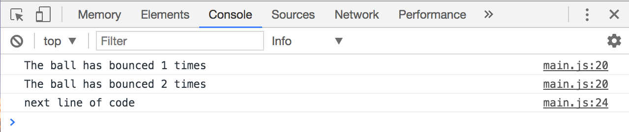 // This loop will run twicefor (let i = 0; i < 2; i++) { bounceBall() const timesBounced = i + 1 console.log('The ball has bounced ' + timesBounced + ' times')}