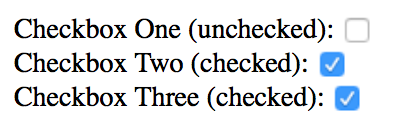 Built-in attributes have a unique behavior. When an attribute is present, they’re always in a true state. To see this in action, let’s say you have three checkboxes as follows: