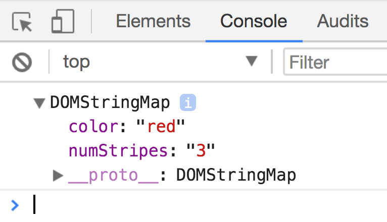 console.log(clownHatColor) // => 'red'console.log(clownHatStripes) // => '3'All attribute values are strings. If you need need to convert a string back into a number (like clownHatStripes), you can use parseInt.