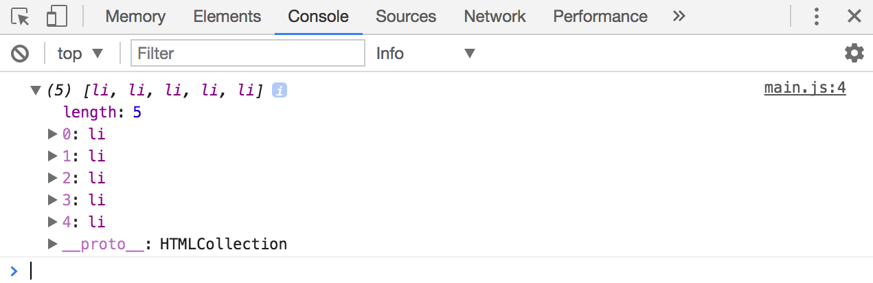 <ul class="list"> <li><a href="#">Link 1</a></li> <li><a href="#">Link 2</a></li> <li><a href="#">Link 3</a></li> <li><a href="#">Link 4</a></li> <li><a href="#">Link 5</a></li></ul>const list = document.querySelector('.list')const listItems = list.children