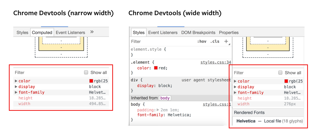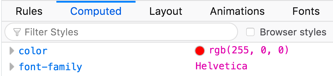 For Chrome dev tools, look under “Elements”. If the dev tools window is large, you can see the computed styles on the right panel. If the dev tools window is small, you can look under the “Computed” tab.
