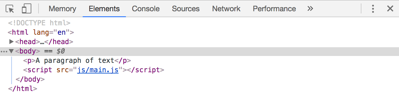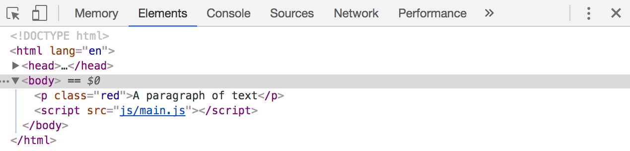 <p>This is a paragraph of text</p>const p = document.querySelector('p')p.classList.add('red')If you check your paragraph in the DOM, you should see the red class: