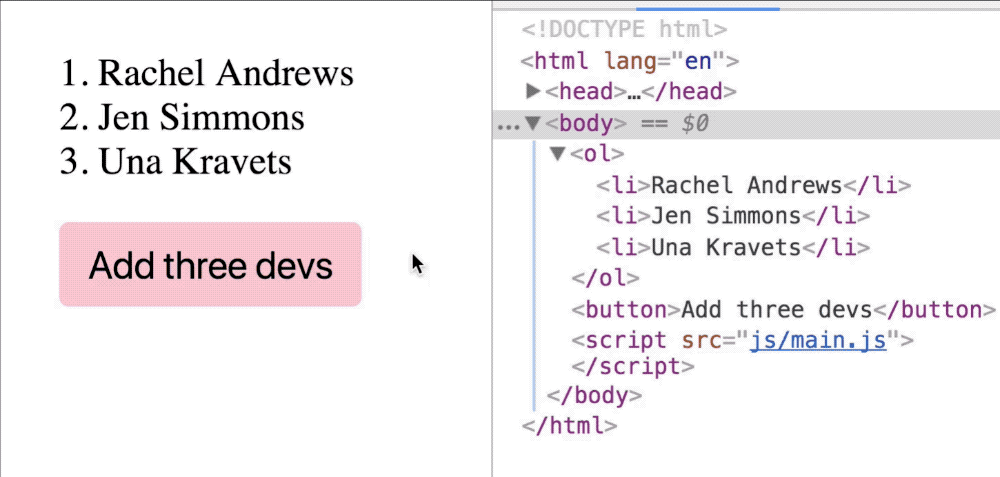 const string = devs.map(dev => `<li>${dev}</li>`).join('')ol.innerHTML = ol.innerHTML + stringThe downside of this approach? You replace the entire list. The GIF below proves that the first three items are also replaced even though they’re not changed.