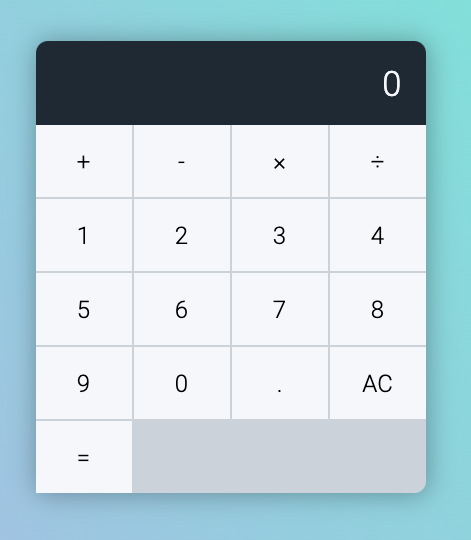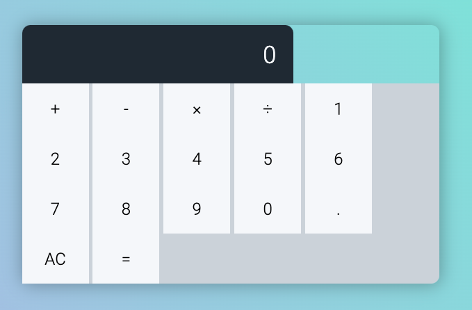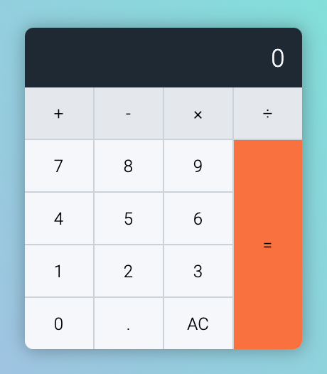 <div class="calculator__keys"> <button>+</button> <button>-</button> <button>×</button> <button>÷</button> <button>1</button> <button>2</button> <button>3</button> <button>4</button> <button>5</button> <button>6</button> <button>7</button> <button>8</button> <button>9</button> <button>0</button> <button>.</button> <button>AC</button> <button>=</button></div>