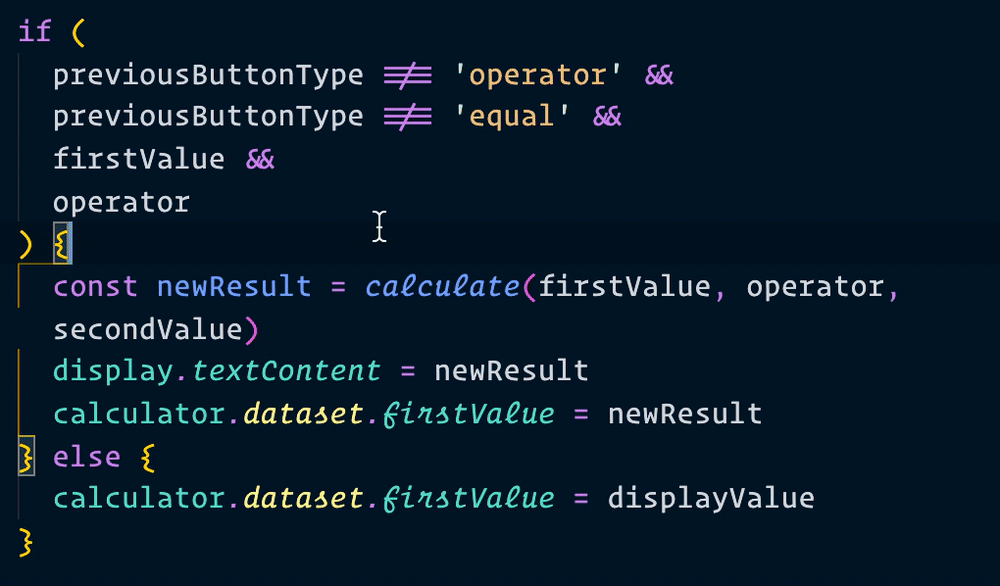 if (/*...*/) { // Calculate goes here }}if (buttonType === 'equal') { const firstValue = parseFloat(calculator.dataset.firstValue) const operator = calculator.dataset.operator const modifierValue = parseFloat(calculator.dataset.modifierValue) const secondValue = modifierValue || parseFloat(result)