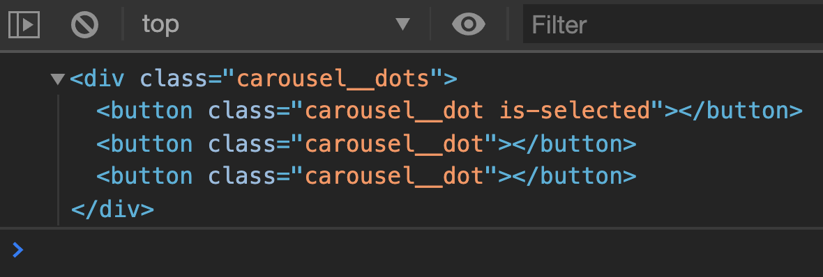 function createDots() { // ... slides.forEach(slide => { const dot = document.createElement('button') dot.classList.add('carousel__dot') dotsContainer.appendChild(dot) })}If you log dotsContainer, you should see three <button> elements.