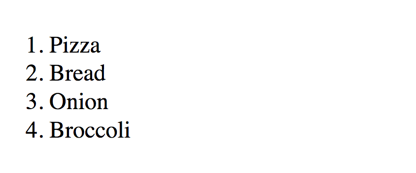 const element = document.querySelector('div')element.innerHTML = `<ol> <li>Pizza</li> <li>Bread</li> <li>Onion</li> <li>Broccoli</li> </ol>`