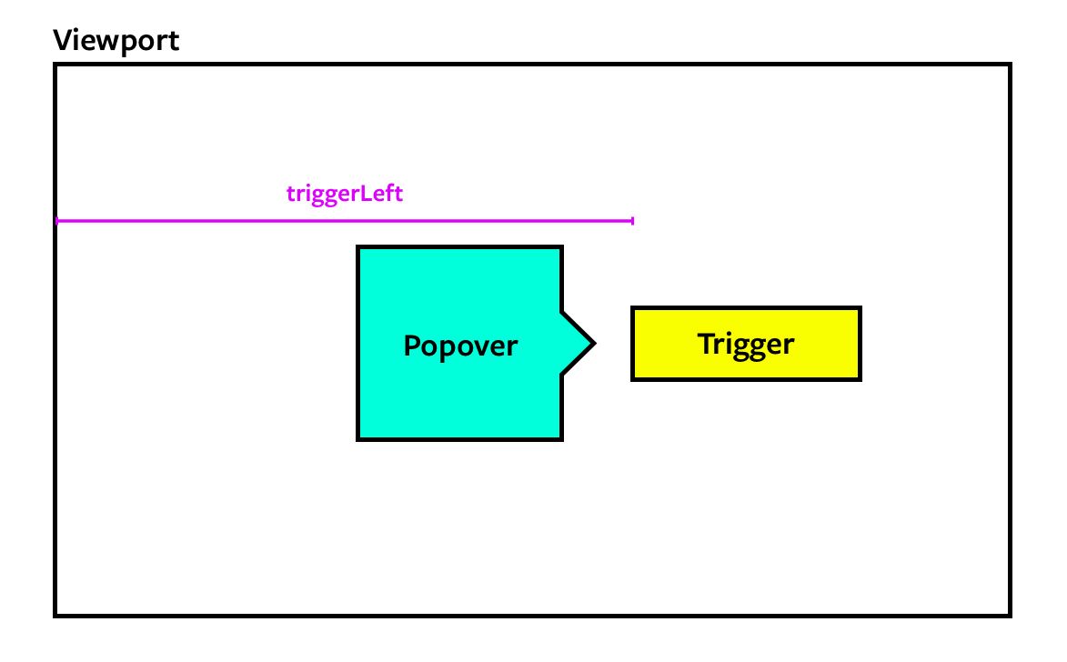 const popoverTriggerRect = popoverTrigger.getBoundingClientRect()const triggerLeft = popoverTriggerRect.leftThe trigger’s left value is a sum of the popover’s left, the popover’s width, and some breathing space.